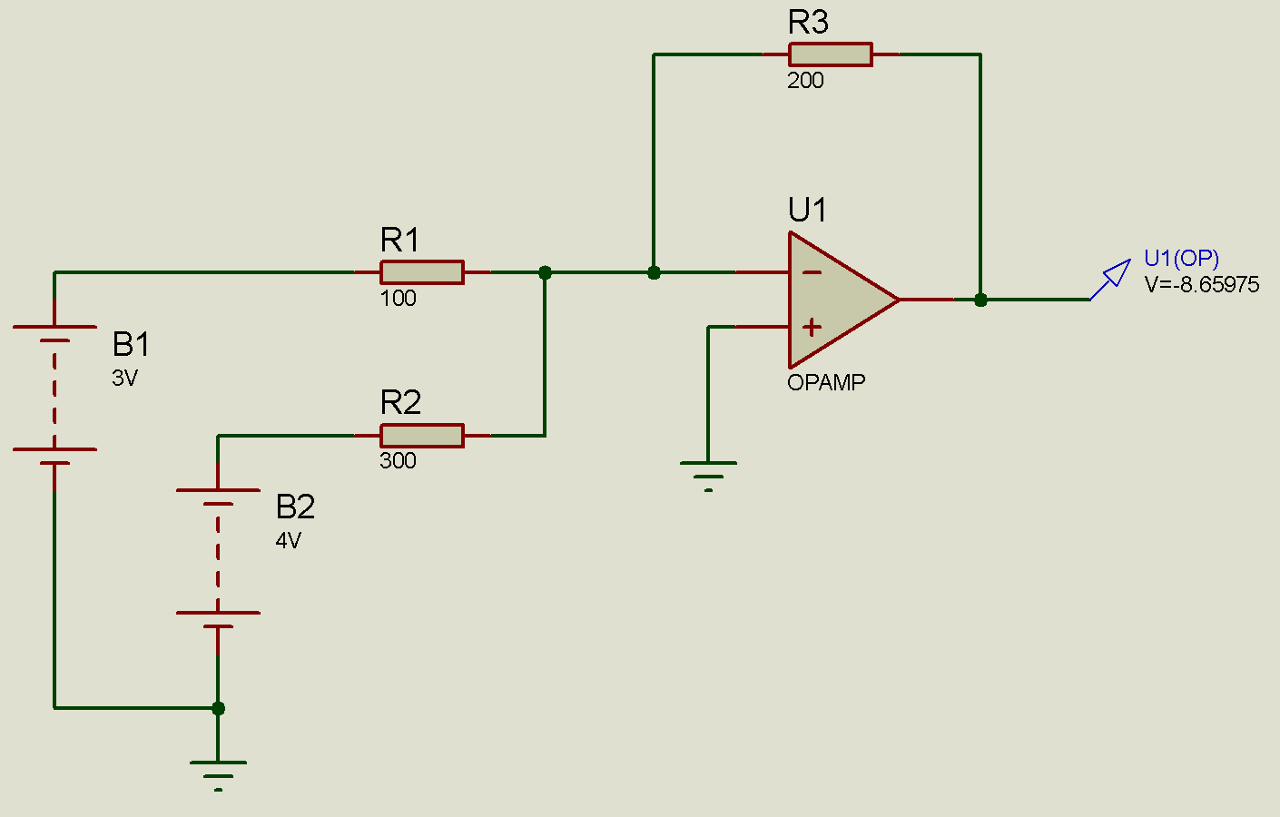 Dari simulasi diatas dapat di lihat output penguat pembalik penjumlah menghasilkan tegangan sebesar 8.6 Volt, untuk pembuktian perhitungannya dapat di lihat di bawah ini :